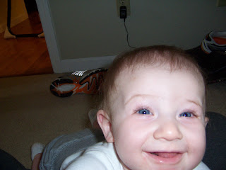 These were the only two pictures he'd let me take today. He kept running away! Silly boy. He's so busy these days, and is pulling up everywhere. Every day I go in to his room to get him up and he's standing there waiting. He's also jabbering non-stop, with his favorite sound being "babababababbaba". It's too cute! And, he's been eating like such a big boy. Today he had his first green veggie (green beans), and he ate it all. He hasn't refused anything yet! We'll try peas on Friday, and after that, we'll have tried all of the "stage one" foods. I can't believe he's 7 months old!